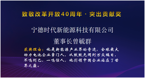 頒獎(jiǎng)詞:他是新能源產(chǎn)業(yè)界的奇跡,全球最大動(dòng)力電池企業(yè)掌門(mén)人,從默默無(wú)聞到萬(wàn)眾矚目,不鳴則已,一鳴驚人,他引領(lǐng)中國(guó)企業(yè)站在了世界之巔。