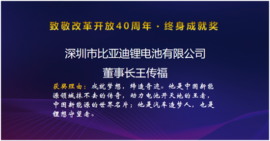 最重磅的“致敬改革開(kāi)放40周年-終身成就”獎(jiǎng)項(xiàng)頒發(fā)給了中國(guó)船舶重工集團(tuán)動(dòng)力股份有限公司總經(jīng)理劉寶生和深圳市比亞迪鋰電池有限公司董事長(zhǎng)王傳福。