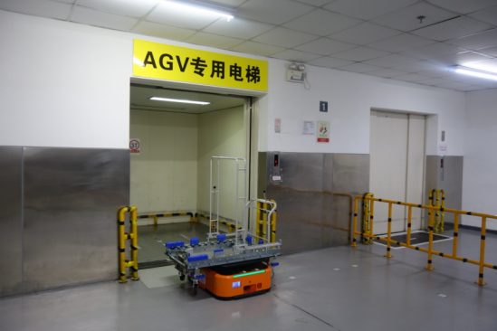 AGV小機器人搭乘專用電梯送貨