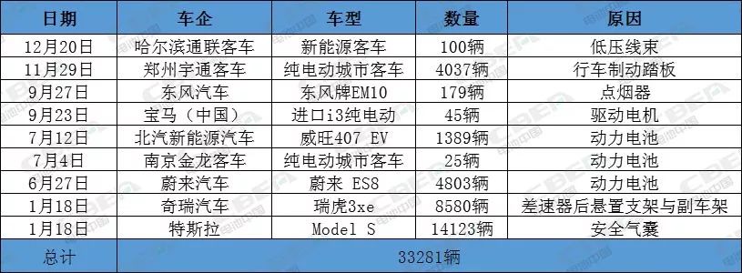 2019年新能源汽車召回33281輛 動力電池問題僅占18.68%