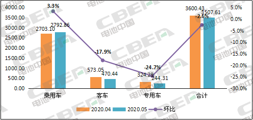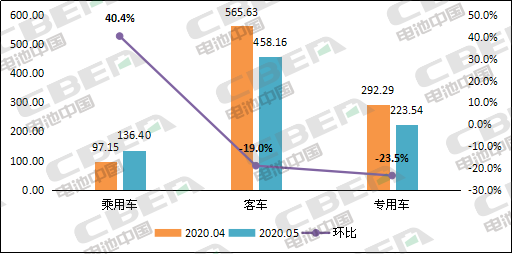從車輛類型來看,2020年5月新能源乘用車搭載的動力電池裝機量約2.79GWh,環比增長3.3%,占比79.6%,較上個月提升4.5個百分點;新能源客車搭載的動力電池裝機量約0.47GWh,環比下降17.9%,占比13.4%,較上個月下滑2.5個百分點;新能源專用車搭載的動力電池裝機量約0.24GWh,環比下降24.7%,占比7.0%,較上個月下滑2個百分點。