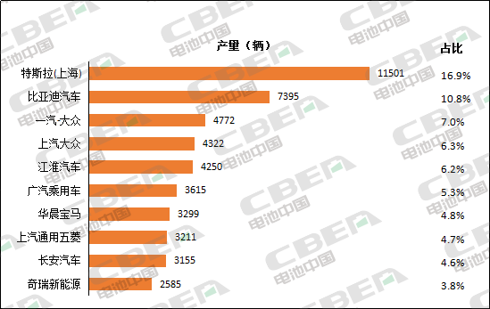 值得注意的是,本月外資及合資車企發力,在5月新能源乘用車產量排名前十的車企中,外資及合資車企占半數。排名前十的車企依次為特斯拉(上海)、比亞迪汽車、一汽-大眾、上汽大眾、江淮汽車、廣汽乘用車、華晨寶馬、上汽通用五菱、長安汽車、奇瑞新能源,產量合計占5月新能源乘用車產量的70.6%。其搭載的動力電池基本是來自國內裝機量排名靠前的幾家電池生產企業。