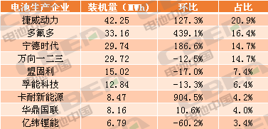 4月份排名前十的電池生產企業分別為寧德時代、LG化學、比亞迪、中航鋰電、時代上汽、國軒高科、力神、億緯鋰能、鵬輝能源、塔菲爾。