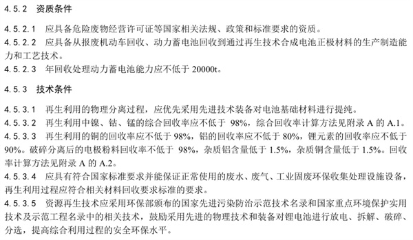 資質條件和技術條件方面,要求再生利用企業年回收處理動力蓄電池能力應不低于20000t。再生利用中,鎳、鈷、錳的綜合回收率應不低于98%。