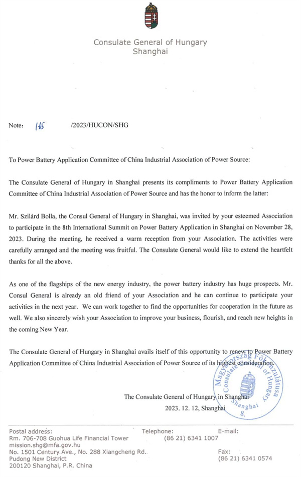匈牙利駐上??傤I事館給動力電池應用分會的感謝信
