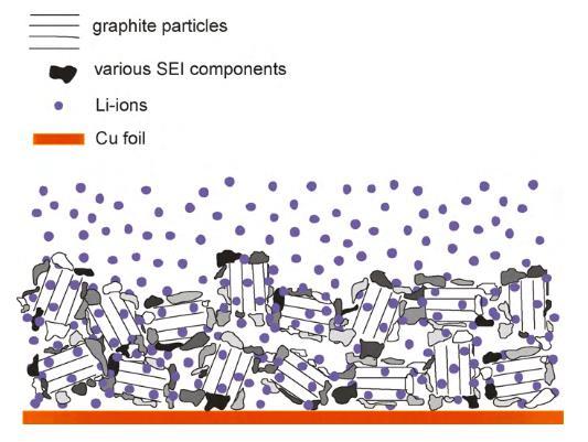 SEI 膜形成于電池的首次充放電過程中,鋰離子與溶劑(EC/DMC)、痕量水、HF等在石墨表面形成的一層鈍化膜,一層包含高分子與無機鹽的多空層。下面三張圖比較清晰的標(biāo)明了SEI所處的位置。(如圖3)
