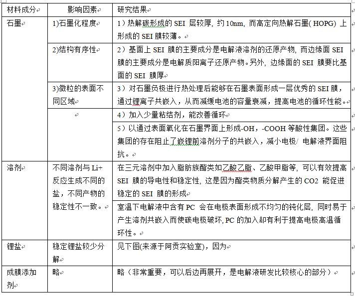 SEI膜的形成主要受到石墨、電解液(溶劑、鋰鹽)的影響,改善也是從這三個方面進行.大致總結(jié)如下,如果是針對不同的石墨材料(人造石墨、MCMB、中間相微球)、電解液添加劑,展開較多,就不再展開。