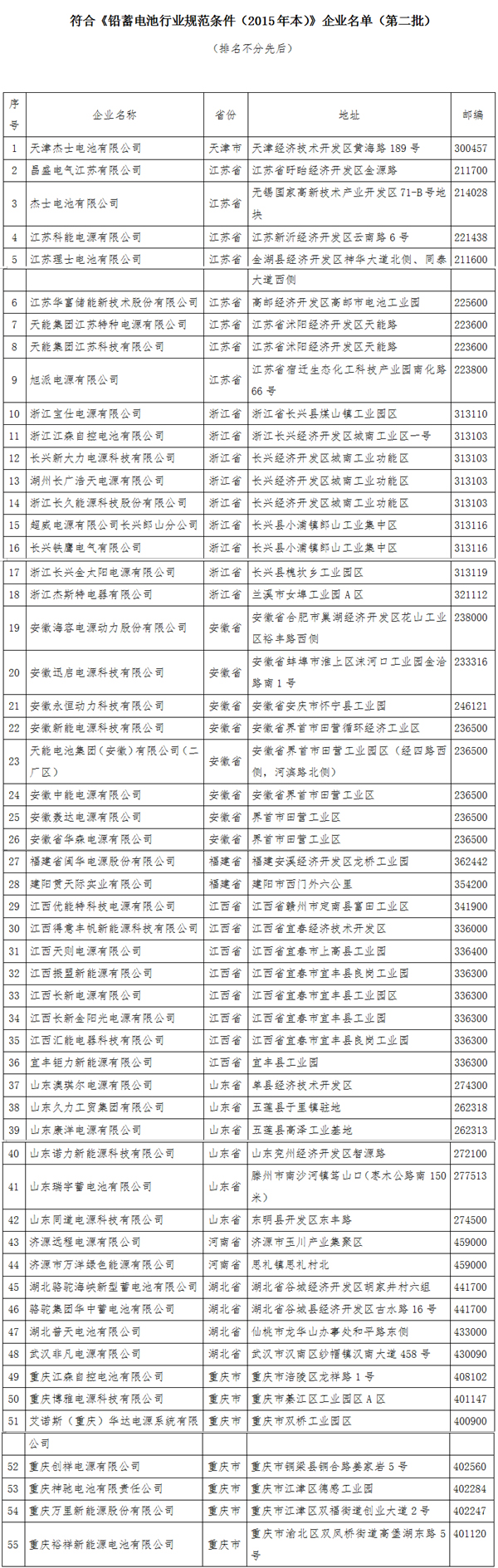 符合《鉛蓄電池行業(yè)規(guī)范條件(2015年本)》企業(yè)名單(第一批)