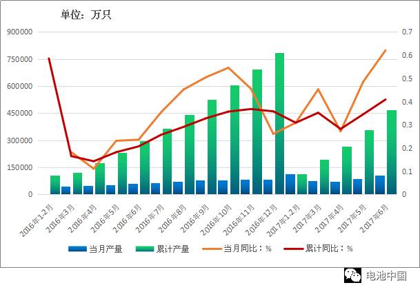 據(jù)國(guó)家統(tǒng)計(jì)局最新公布數(shù)據(jù)顯示,2017年6月,全國(guó)鋰離子電池產(chǎn)量為105986.9萬只,同比增長(zhǎng)77.02%;1-6月累計(jì)完成產(chǎn)量為468348.8萬只,同比增長(zhǎng)57.37%。