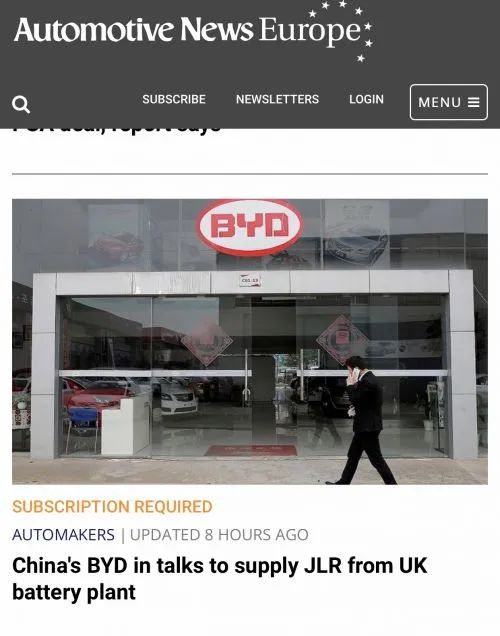 捷豹路虎或將與比亞迪在電池供應方面達成合作。