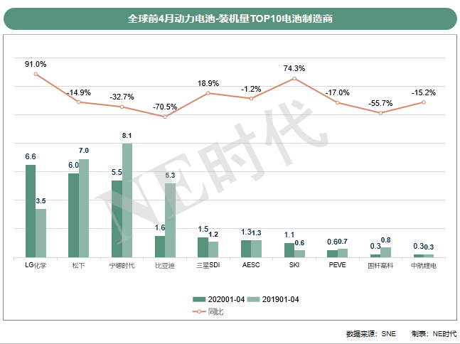 在特斯拉有意與多家供應商合作后,松下的優(yōu)勢就被吞噬。今年它的累計量位居第二,與去年同期相比下降了14.9%。國內電池廠,比較讓人意外的是AESC和中航鋰電,下降速度低于市場平均水平。中航鋰電從3月份開始進入全球動力電池裝機量的TOP10。LG化學同比增長91.0%至6.6 GWh,從去年同期的第四位躍居第一。三星SDI裝機量為1.5GWh,增長了18.9%,名次上升五位。SKI上漲74.3%至1.1GWh,上升兩個名次。三家公司的增長歸功于配套車型的銷量增長。LG化學綁定的特斯拉國產Model 3和奧迪e- tron EV 銷量強勁,導致裝機量激增。奧迪e-tron前4個月售出1.25萬輛,是TOP10全球新能源汽車。
