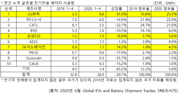 LG化學、松下、寧德時代站在頂端,吞去全球動力電池需求量的七成,給其他電池供應商留下三成。唯三實現增長的電池廠均是韓國企業(yè),LG化學、三星SDI和SKI,且均是兩位數增長。除了AESC的其他電池廠反向而走,兩位數下滑。