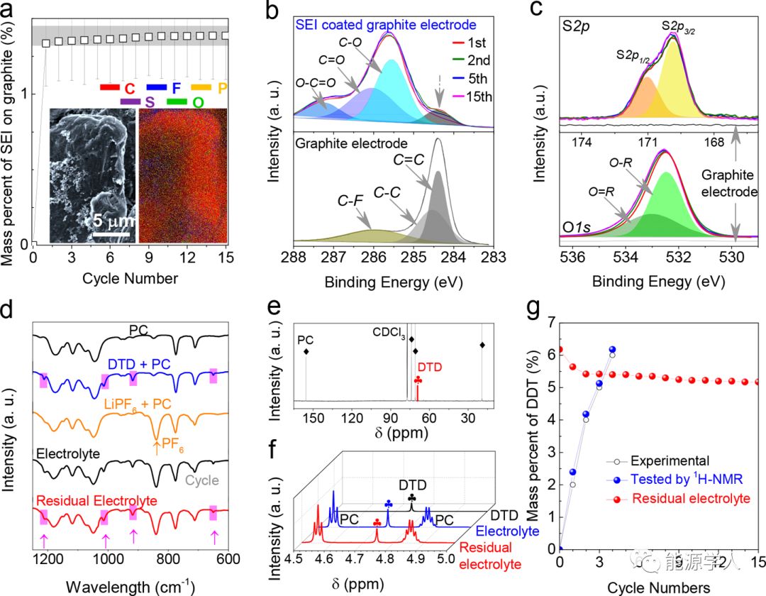在過(guò)去的20年中,許多添加劑(例如:碳酸亞乙烯酯(VC)、LiBOB、金屬離子、鈉鹽或鉀鹽、乙烯基亞硫酸乙烯酯(VES)、1,3-丙烯磺內(nèi)酯、三氧化硫、磷酸酯、三(三甲基三甲硅烷基)亞磷酸酯和呋喃酮)通常用作SEI成膜劑,可保護(hù)石墨陽(yáng)極,并確保石墨中可逆的Li+脫嵌。在本文中,作者發(fā)現(xiàn)重復(fù)充放電過(guò)程中添加劑(例如DTD)的消耗很有限。在初始循環(huán)中,SEI在石墨表面上快速形成,然而其重量、形態(tài)或組成沒(méi)有明顯變化(圖2a)。XPS分析進(jìn)一步證實(shí)了這種現(xiàn)象。與原始狀態(tài)相比,圖2b, c中石墨電極的C 1s,S 2p和O 1s峰的強(qiáng)度、形狀和擬合顯示出在第一個(gè)循環(huán)中與原始狀態(tài)相比有明顯的變化,表明了在第一個(gè)循環(huán)中SEI的形成,此后變化很小。