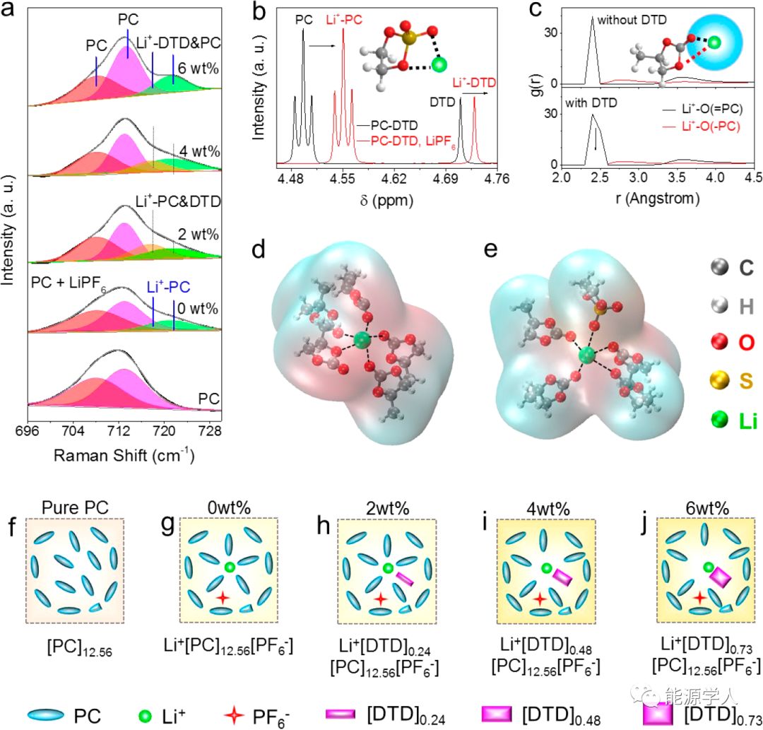 通過(guò)對(duì)含有不同DTD濃度的PC基電解液進(jìn)行拉曼光譜分析,可以獲得對(duì)電解液配位化學(xué)的深入了解。首先,觀察到,一旦LiPF6鹽溶解,擬合峰出現(xiàn)在718和721 cm-1附近,該峰對(duì)應(yīng)于PC分子的不對(duì)稱環(huán)變形,數(shù)量減少并且移向更高的波數(shù);其歸因于Li+-PC團(tuán)簇的形成和電解液中游離PC分子(即Li+[PC]12.56[PF6-])的濃度降低。在將DTD添加到電解液中(低于6 wt%DTD)時(shí),由于Li+團(tuán)簇(即Li+-PC&DTD)中Li+-DTD和Li+-PC的相互作用不同,因此Li+-PC的峰變寬了。DTD分子可以與Li+(即Li+[DTD]x[PC]12.56[PF-]6,x = 0,0.24,0.48,0.73)競(jìng)爭(zhēng)配位。當(dāng)DTD濃度為6 wt%(即Li+[DTD]0.73[PC]12.56[PF6-])時(shí),Li+團(tuán)簇和游離PC明顯分離。