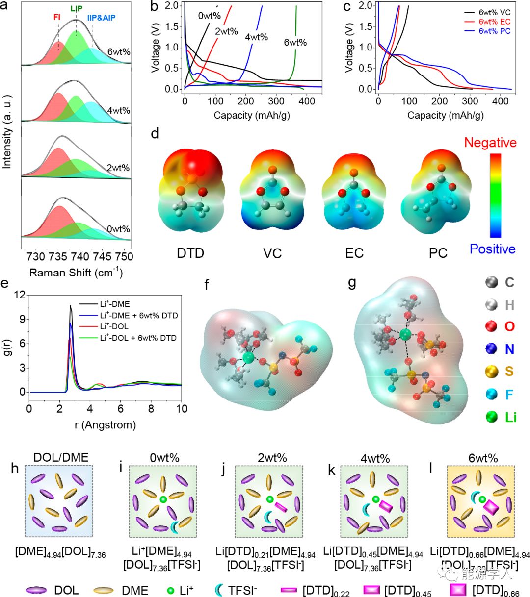 此外,使用弱配位添加劑(例如:VC、EC和PC)的醚基電解液在1.0-0.1 V電壓范圍內(nèi)具有更嚴(yán)重的電解液分解和Li+-溶劑嵌入石墨的現(xiàn)象(圖4c),這進(jìn)一步證實(shí)了添加劑協(xié)調(diào)能力的重要性(圖4d)。仿真模擬可以進(jìn)一步證實(shí)該結(jié)論,具體而言,當(dāng)將DTD添加劑添加到電解液中時(shí),出現(xiàn)在Li+周圍的醚基溶劑的頻率顯著降低(圖4e)。圖4f,g清楚地表明乙醚溶劑可以被DTD取代,從而導(dǎo)致弱的Li+-溶劑相互作用。因此,圖4h-l進(jìn)一步顯示了DOL/DME,LiTFSI和不同量的DTD添加劑之間的分子相互作用的示意圖,以使Li+-溶劑相互作用的變化清晰可見(jiàn)。