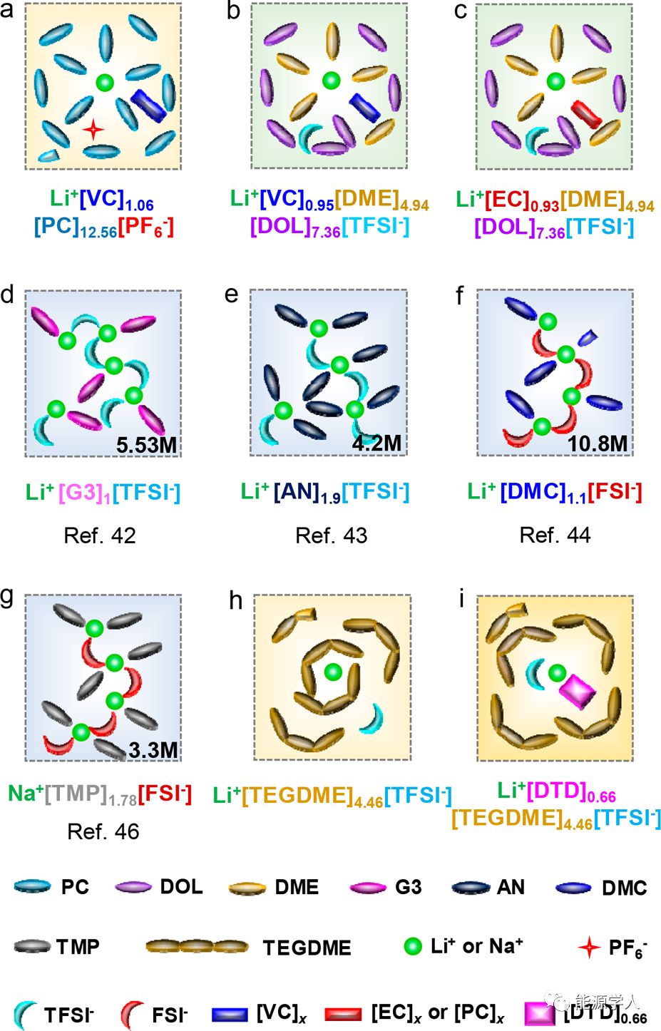 此外,當(dāng)在PC中的1.0M LiPF6或DOL/DME中的1.0M LiTFSI的電解液中使用不同的添加劑(例如:VC、EC或PC)時(shí),Li+-溶劑的相互作用在圖5a-c中進(jìn)一步顯示。基于這些結(jié)果,提出了另一種觀點(diǎn),這為石墨在超高濃度電解液體系中的穩(wěn)定性帶來(lái)了重要的新見(jiàn)識(shí)。結(jié)果表明,在較高的鹽濃度下Li+-溶劑相互作用降低或溶劑的配位能力較弱可能是石墨穩(wěn)定的根本原因。換句話說(shuō),如果可以通過(guò)強(qiáng)配位添加劑(例如DTD)充分削弱Li+-溶劑的相互作用,則SEI效應(yīng)可能不是最關(guān)鍵的因素,并且可能不需要完全聚集。此外,作者研究了與文獻(xiàn)報(bào)道的高濃度電解液概念相關(guān)的加性效應(yīng),發(fā)現(xiàn)高濃度電解液中溶劑/Li+的比例僅為約1-3(即Li+[溶劑]1-3[陰離子],圖5d-g),低于現(xiàn)在的電解液(例如Li+[DTD]x[PC]12.56[PF-]6)和市售電解液中的數(shù)量(例如Li+[EC]7.49[DEC]4.12[PF6-], 1.0 M LiPF6-EC/DEC)。因此,廣泛研究的(超高)濃縮電解液概念和所提出的電解液體系中的累加效應(yīng)代表改變Li+溶劑化結(jié)構(gòu)的不同方式(例如:Li+-溶劑相互作用)。