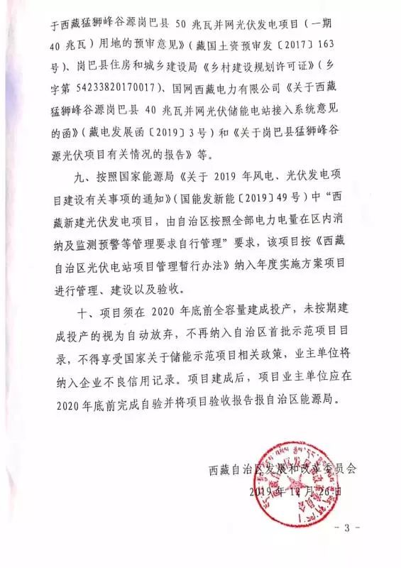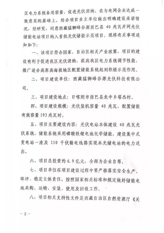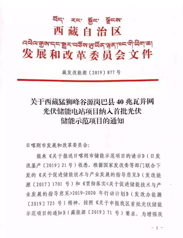 12月26日,西藏自治區發展和改革委員會下發《關于西藏猛獅峰谷源崗巴縣40兆瓦并網光伏儲能電站項目納入首批光伏儲能示范項目的通知》(藏發改能源〔2019〕877號),批復同意西藏猛獅峰谷源崗巴縣40MW光伏+193MWh儲能項目納入西藏首批光儲示范項目。文件肯定了西藏猛獅峰谷源崗巴縣40兆瓦并網光伏儲能電站項目推廣高原高海拔地區儲能系統的積極示范作用。