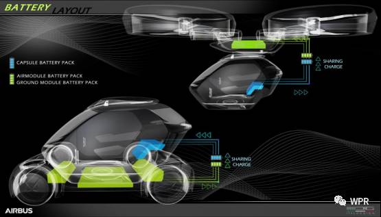 與地面模塊相對應的飛行模塊,則是由一架直徑為4.4米,4個旋翼的無人機操控,無人機的輪子旋轉產生巨大的升力,中間的凹槽固定駕駛艙車身,可垂直起降。無可通過AI平臺和手機APP控制,空中推進模塊采取電力驅動。