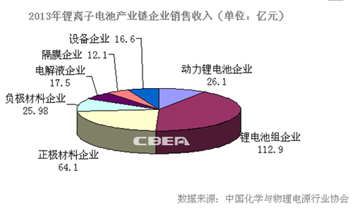 鋰離子電池產(chǎn)業(yè)的迅猛發(fā)展,同樣帶動產(chǎn)業(yè)鏈上相關(guān)行業(yè)的發(fā)展。據(jù)中國化學(xué)與物理電源行業(yè)協(xié)會統(tǒng)計,2013年位居行業(yè)前10位的動力鋰電池生產(chǎn)企業(yè)銷售收入約為26.1億元、10家主要鋰電池組生產(chǎn)企業(yè)銷售收入為112.9億元、12家正極材料生產(chǎn)企業(yè)銷售收入為64.1億元、11家負(fù)極材料生產(chǎn)企業(yè)銷售收入為25.98億元、9家鋰離子電池電解液企業(yè)銷售收入17.5億元、10家鋰離子電池隔膜企業(yè)銷售收入12.1億元、14家鋰離子電池設(shè)備企業(yè)銷售收入16.6億元。綜合上述數(shù)據(jù),2013年鋰離子電池產(chǎn)業(yè)鏈相關(guān)企業(yè)總銷售收入達(dá)275.28億元。