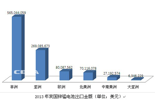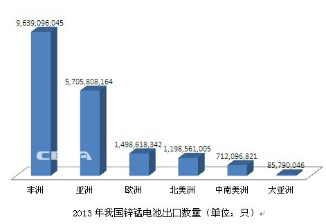 據(jù)中國化學(xué)與物理電源行業(yè)協(xié)會(huì)發(fā)布的《2013年我國電池產(chǎn)業(yè)出口數(shù)據(jù)》,2013年,我國鋅錳電池出口量為188.39億只,2012年出口量為186.49億只,出口量同比增長1.01%。2013年鋅錳電池出口額為10.17億美元,2012年出口額為10.27億美元,同比減少0.97%。其中,出口非洲金額同比增長7.4%,出口亞洲同比減少15.9%。出口歐洲同比減少4.4%,出口北美同比增長8.2%。
