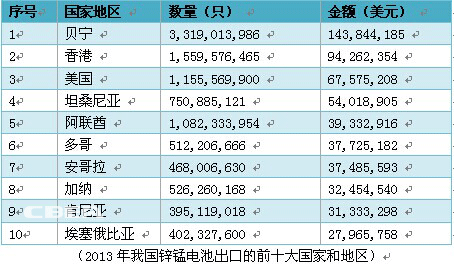 2013年,我國鋅錳電池出口的前十大國家和地區(qū)分別為貝寧、香港、美國、坦桑尼亞、阿聯(lián)酋、多哥、安哥拉、加納、肯尼亞、埃塞俄比亞。其中,共出口貝寧共和國3,319,013,986只鋅錳電池,出口金額143,844,185美元。