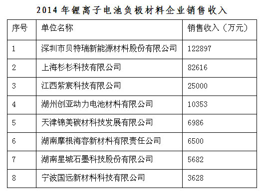8家鋰離子電池負(fù)極材料企業(yè)2014年總產(chǎn)量52858噸,總銷量47778噸,全年實(shí)現(xiàn)銷售收入26.36億元;出口負(fù)極材料18818噸,實(shí)現(xiàn)出口額9.5億元。
