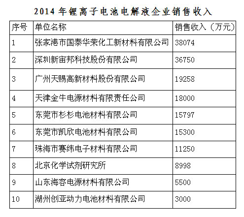 10家鋰離子電池電解液企業(yè)在2014年全年共實(shí)現(xiàn)銷售收入17.19億元。其中全年總產(chǎn)量37241噸,總銷量36761噸;出口電解液3891噸,出口額2.62億元。