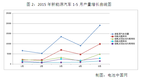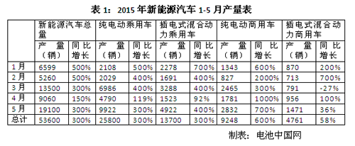 2015年1-5月,新能源汽車累計生產(chǎn)5.36萬輛,同比增長近3倍。其中,純電動乘用車生產(chǎn)2.58萬輛,同比增長近3倍;插電式混合動力乘用車生產(chǎn)1.37萬輛,同比增長3倍;純電動商用車生產(chǎn)9248輛,同比增長近6倍;插電式混合動力商用車生產(chǎn)4761輛,同比增長58%。