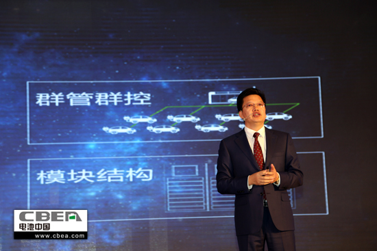 圖為特銳德董事長于德翔介紹CMS主動柔性智能充電系統(tǒng)
