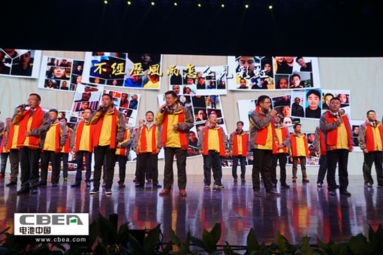 圖為超威集團(tuán)相關(guān)領(lǐng)導(dǎo)與聯(lián)營(yíng)商代表共同演唱《真心英雄》