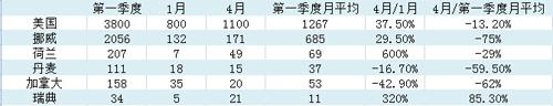 特斯拉1月和4月全球市場交付預估量對比(單位:輛)