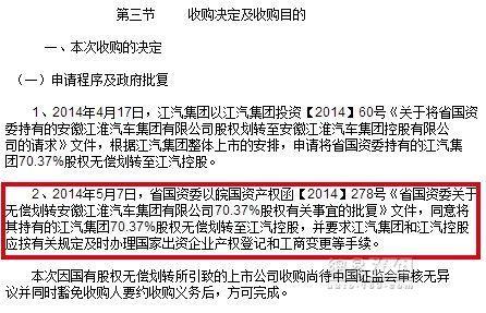 江淮汽車也同時(shí)發(fā)布關(guān)于收到控股股東《關(guān)于安徽江淮汽車集團(tuán)有限公司股權(quán)劃轉(zhuǎn)的通知》的提示性公告2014年5月15日公司收到控股股東江汽集團(tuán)《關(guān)于安徽江淮汽車集團(tuán)有限公司股權(quán)劃轉(zhuǎn)的通知》),根據(jù)安徽省國資委(皖國資產(chǎn)權(quán)函【2014】278號(hào))《省國資委關(guān)于無償劃轉(zhuǎn)安徽江淮汽車集團(tuán)有限公司70.37%股權(quán)有關(guān)事宜的批復(fù)》,安徽省國資委將其持有江汽集團(tuán)70.37%的股權(quán)無償劃轉(zhuǎn)至安徽江淮汽車集團(tuán)控股有限公司(簡稱“江汽控股”)。本次股權(quán)劃轉(zhuǎn)行為完成后,江汽控股通過江汽集團(tuán)間接持有公司35.43%的股份,公司的實(shí)際控制人未發(fā)生變化,仍為安徽省國資委。