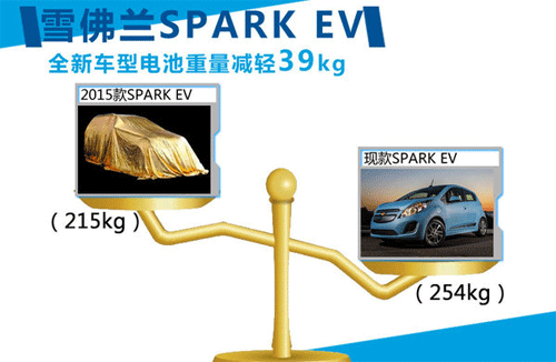 通用汽車將2015款雪佛蘭SPARK EV車型改為自產電池系統,由通用位于密歇根州的Brownstown工廠負責生產。此外還將對其生產的電池進行改良,在保持原有性能的同時,由于全新電池組容量從此前的21kWh降低為19kWh,因此整車重量也降低至215kg,比現款車型所采用的A123 Systems公司電池減輕39kg,進一步降低了新車型的耗電量。