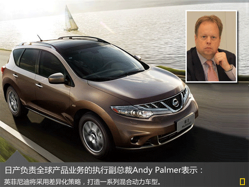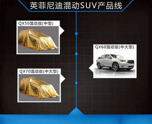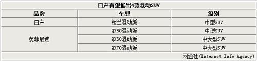 日產(chǎn)汽車此前計劃在2016年將推15款混動車型,該計劃將涉及到日產(chǎn)和英菲尼迪兩大品牌。日產(chǎn)負(fù)責(zé)全球產(chǎn)品業(yè)務(wù)的執(zhí)行副總裁Andy Palmer曾表示:為了避免同已經(jīng)占領(lǐng)市場的歐洲豪車直接競爭,英菲尼迪將采用差異化策略,打造一系列混合動力車型,包括注重運動性能的轎車、轎跑和跨界SUV等。未來,日產(chǎn)旗下混動SUV車型將增至4款。英菲尼迪中國事業(yè)部總經(jīng)理戴雷在接受采訪時曾表示:混合動力是我們未來發(fā)展的一大重點,會有多款使用此技術(shù)的新車型推出。除已確認(rèn)的QX60混動版今年將在華上市外,其他三款SUV均有望入華銷售。