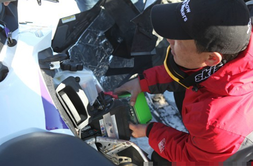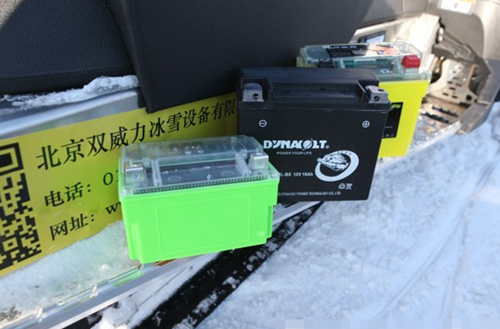 一個小時的時間很快過去,我們急切地取出了埋在雪中的電池,在李欣先生的協助下,我們把三塊電池中實際容量最大的猛獅GHD20HL-BS電池連接到了一臺600mL排量的龐巴迪(BRP)SKI-DOO雪地摩托車上。隨著正負極連接妥當,激動人心的時刻也到來了:擰動鑰匙門,發(fā)動機瞬間爆發(fā)出如虎嘯般地轟鳴,猛獅電池一次性成功!但是吳總似乎還意猶未盡:關閉鑰匙門、再次發(fā)動、再關閉、再發(fā)動……我們連續(xù)啟動了多次,猛獅電池無一失手!