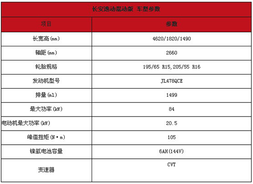 動力方面,逸動混動版搭載汽油機(jī)和電動機(jī)加電池組成的ISG混合動力系統(tǒng),其中汽油機(jī)部分選擇的是長安汽車(微博)全新的1.5L D-VVT Blue Core發(fā)動機(jī),最大功率84kW;電動機(jī)最大功率20.5kW,而鎳氫電池的電壓為為144V,容量為6AH。傳動系統(tǒng)上,新車將配CVT自動變速器。