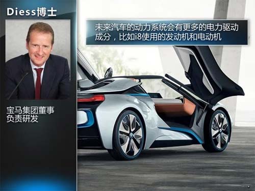 寶馬集團已明確在中國市場的新能源車型發(fā)展路線,隨著中國新能源車市場的逐漸成熟,第一款專為中國研發(fā)的新能源車將很快實現(xiàn)國產(chǎn)。寶馬集團董事Diess博士(負責研發(fā))表示:未來汽車的動力系統(tǒng)會有更多的電力驅(qū)動的成分,比如i8使用的發(fā)動機和電動機。