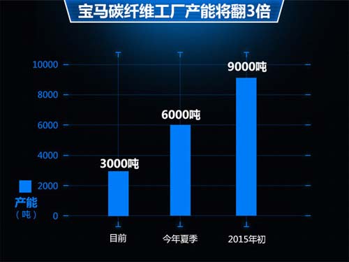 目前寶馬美國摩西湖工廠的產(chǎn)能為3000噸,擁有兩條生產(chǎn)線,其碳纖維材料目前專供寶馬i3和i8的生產(chǎn),在今年夏天該工廠將啟用第三、四條生產(chǎn)線,并且年 產(chǎn)能可達6000噸。2014年5月9日舉辦的奠基儀式中,第五、六條生產(chǎn)線的鋪設工程正式啟動,這也為在明年年初達到9000噸的產(chǎn)能提前半年做好了準備。