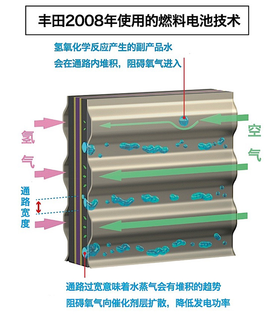 豐田Mirai搭載的燃料電池堆棧是由370片薄片燃料電池組成的,因此被稱為“堆棧”,一共可以輸出114千瓦的發電功率。此前我們也分析了大眾集團的燃料電池技術,結構基本類似。豐田的燃料電池堆棧經歷了十幾年的技術優化,形成了自己的特色結構,比如3D立體微流道技術,通過更好地排出副產物水,讓更多空氣流入,有效改善了發電效率。所以整個堆棧的發電效率達到了世界先進水平,達到了3.1千瓦/升,比2008年豐田的技術整整提升了2.2倍。