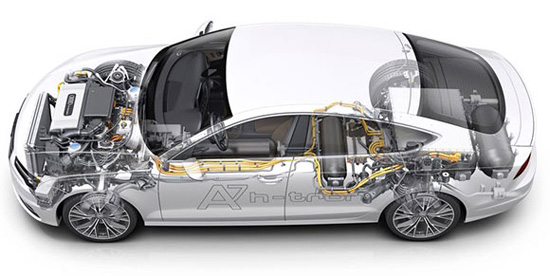 如果加上8.8千瓦時鋰離子電池組的電力,還能額外增加的50公里純電里程,而這個電池是可以通過動能回收和充電裝插電來補充電量的,所以A7 h-tron被稱為插電式混合動力燃料電池汽車。