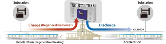 東芝公司的TESS安裝在Tobu Urban Park Line線的Unga站,使用東芝SCiBTM可充電電池儲存再生電能。SCiBTM擁有出色的性能,包括安全性高、荷電范圍廣、低溫運行穩定等。東芝公司的TESS的電池容量是傳統牽引式儲能系統的10倍,可以實現高效地充放電。此外,TESS還采用了東芝公司擁有專利權的充放電控制技術,可以充分利用SCiBTM廣泛的荷電范圍。