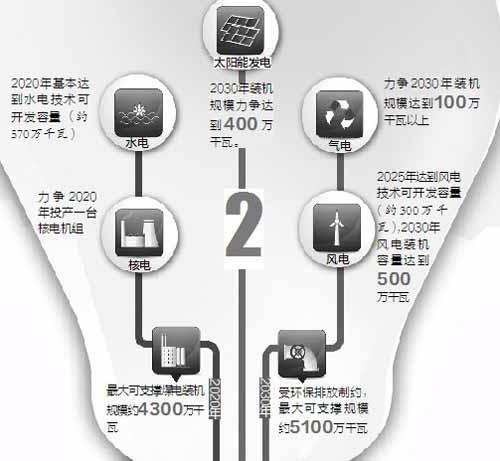 根據規劃,江西省將進一步挖掘水電裝機潛力,2020年基本達到水電技術可開發容量(約570萬千瓦),同時積極推動抽水蓄能電站建設;核電方面,江西省將密切跟蹤國家內陸核電政策,力爭2020年投產一臺核電機組;氣電方面,江西將根據非常規天然氣資源開發情況適時啟動天然氣分布式發電建設,力爭2030年裝機規模達到100萬千瓦以上;風電建設方面,江西將加快風能資源的分散開發利用,2025年達到風電技術可開發容量(約300萬千瓦),隨著低風速發電技術的成熟和推廣,2030年風電裝機容量有望達到500萬千瓦;鼓勵建設分布式太陽能光伏發電系統,2030年裝機規模力爭達到400萬千瓦。