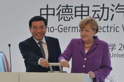 7月8日,默克爾與中國工信部部長苗圩在清華大學共同拉動代表中德電動車合作項目的手柄,中德電動汽車充電項目正式啟動。
