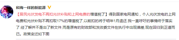 [摘要]報道“中國自建光伏電站第一人”任凱通過微博透露:“得到國家電網北京順義供電公司通知,個人光伏發電的上網電費和光伏補貼不再扣取17%的增值稅,以前扣的將于明年1月退還。”