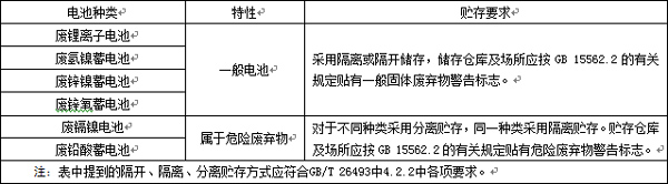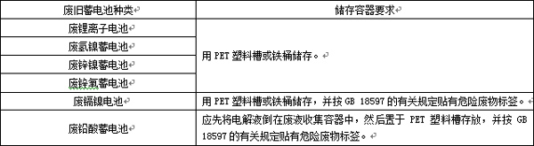 8.2.1 各類廢舊蓄電池應根據廢電池特性采用相應的儲存容器,并符合表2中規定的相關要求。且凡漏液的廢舊蓄電池必須放置在耐酸/耐堿的容器內,電池廢料可用塑料槽或鐵桶儲存。