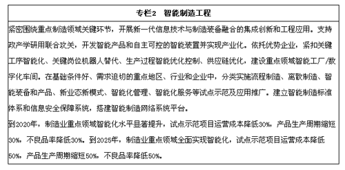加快發(fā)展智能制造裝備和產品。組織研發(fā)具有深度感知、智慧決策、自動執(zhí)行功能的高檔數(shù)控機床、工業(yè)機器人、增材制造裝備等智能制造裝備以及智能化生產線,突破新型傳感器、智能測量儀表、工業(yè)控制系統(tǒng)、伺服電機及驅動器和減速器等智能核心裝置,推進工程化和產業(yè)化。加快機械、航空、船舶、汽車、輕工、紡織、食品、電子等行業(yè)生產設備的智能化改造,提高精準制造、敏捷制造能力。統(tǒng)籌布局和推動智能交通工具、智能工程機械、服務機器人、智能家電、智能照明電器、可穿戴設備等產品研發(fā)和產業(yè)化。