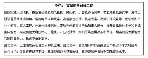 航空裝備。加快大型飛機研制,適時啟動寬體客機研制,鼓勵國際合作研制重型直升機;推進干支線飛機、直升機、無人機和通用飛機產業化。突破高推重比、先進渦槳(軸)發動機及大涵道比渦扇發動機技術,建立發動機自主發展工業體系。開發先進機載設備及系統,形成自主完整的航空產業鏈。