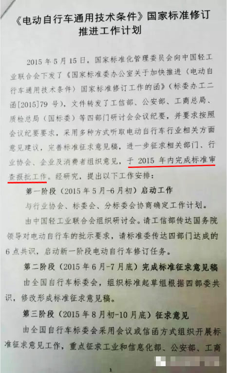 [摘要]一份名為“《電動(dòng)自行車通用技術(shù)條件》國(guó)家標(biāo)準(zhǔn)修訂推進(jìn)工作計(jì)劃”的文字被曝光,文中顯示出 “于2015年內(nèi)完成(電動(dòng)自行車)相關(guān)標(biāo)準(zhǔn)審查報(bào)批工作”字樣,并附有詳細(xì)的工作推進(jìn)計(jì)劃。