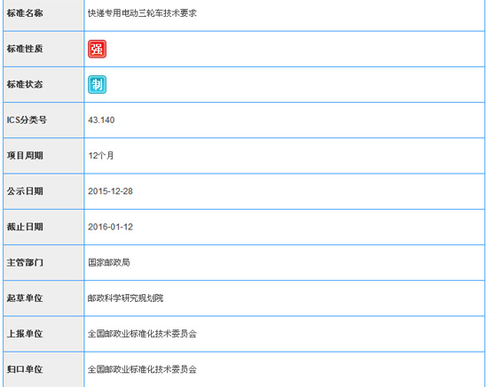 2015年年底,從國家標準委獲悉,國家標準委決定對擬立項國家標準項目《快遞專用電動三輪車技術要求》公開征求意見,征求意見截止時間為2016年1月12日。一旦立項,快遞專用三輪車國家標準將進入制定階段。