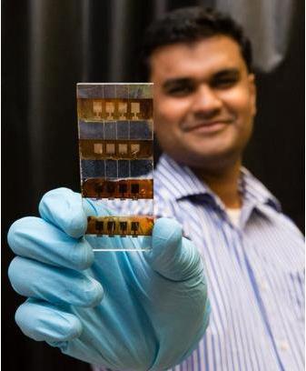 新型固態太陽能電池是一塊由5層材料組成的“三明治”,每一層都具有獨特的作用。第一層導電的玻璃,使太陽光能進入電池;第二層是沉積在玻璃層之上的二氧化鈦,這兩層合在一起作為太陽能電池前部的導電觸點;接下來就是新款太陽能電池的“主角”錫鈣鈦礦,這一層的主要作用是捕獲太陽光。研究人員在一個充滿氮氣的手套式操作箱內制造這一材料,這種工作臺化學方法的目的是保護環境,避免錫鈣鈦礦被氧化。